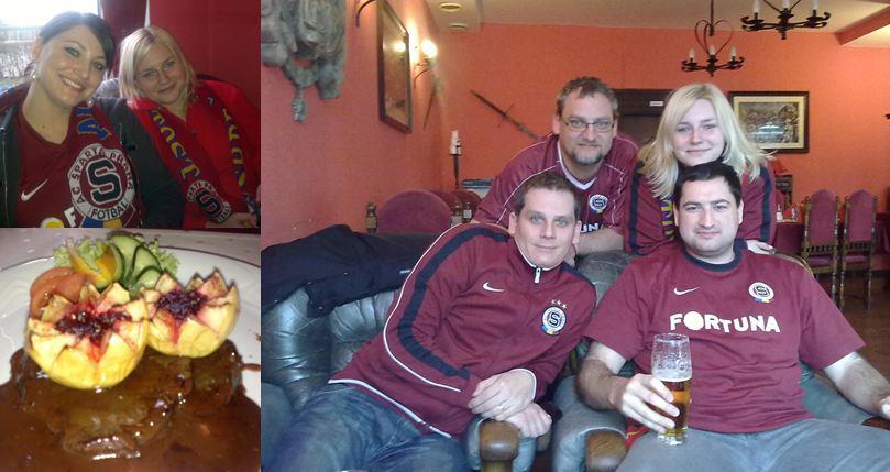 Dokonce jsme do místa určení dorazili se sedmiminutovým náskokem a usedáme do nejmenované luxusní restaurace s koženými sedačkami a příjemnou obsluhou. Dáváme si ta nejvybranější jídla, protože nejsme žádné socky. Jaké je ale naše zděšení, když z hotelu o kousek dál vycházejí liberečtí hráči. Na jednoho z okna zamávám se sparťanskou šálou, na tváři se mu objevil docela příjemný úsměv, asi jsem mu tím ale přinesla štěstí, protože o pár hodin později nám dává jediný gól Liberce. Naše hody pokračují za příjemného pokecu, udělali jsme pár fotek do rodinného alba a po výborné večeři kdosi volal Sektorovi. Prý všichni sparťani pijí na chodnících před benzínkou, protože všechny hospody v centru jsou od dvou hodin zavřené. Sektorovi se v té době zvedá jeho ego, protože to tak hezky naplánoval a patří mu náš velký dík, že místo patníku se můžeme rozvalit na sedačkách a pohodlném gaučíku, a to nejsme žádní gaučáci. :-)